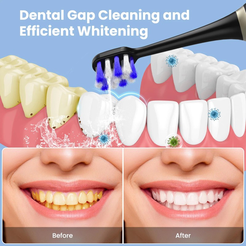 Our 2 In 1 electric toothbrush has a unique design, The brush head is designed with water outlets, which can spray water while brushing, double-cleaning every corner of your teeth and gums, effectively removing food debris hidden in the depths
