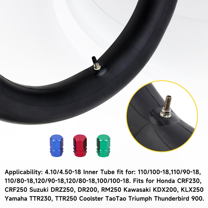 Applicability:4.10/4.50-18 Inner Tube fit for: 110/100-18,110/90-18,110/80-18,120/90-18,120/80-18,100/100-18. Fits for Honda CRF230, CRF250 Suzuki DRZ250, DR200, RM250 Kawasaki KDX200, KLX250 Yamaha TTR230, TTR250 Coolster TaoTao Triumph Thunderbird 900.