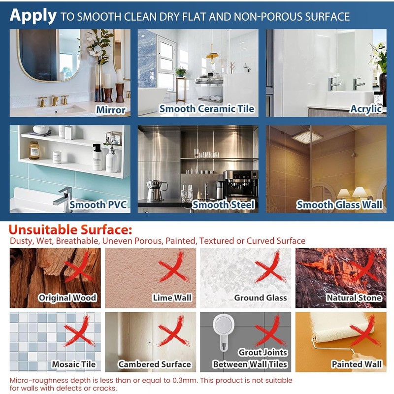 - Important Note: The shower grab bars are ONLY suitable for non-porous, smooth, and flat surfaces like tile, glass, acrylic, and metal. Avoid installation on porous surfaces, grout lines, uneven tiles, unfinished marble, wallpaper, or drywall. These grab bars are designed to assist with balance, not to support full body weight.