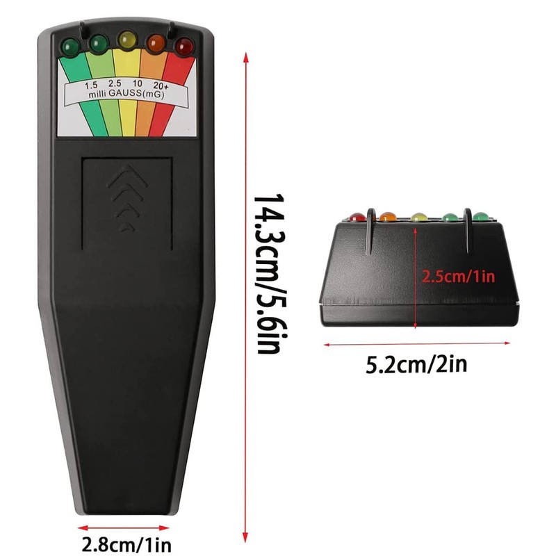 The Five LEDS: The 1st Light detects a Normal EMF field, what is always around us.The range is between 0 to 1.5 mG; The 2nd Light (GREEN) detects a Low Level EMF,which range is between 1.5 to 2.5 mG; The 3rd Light (YELLOW) detects a Mid Level EMF in the range between 2.5 to 10 mG; The 4th Light (ORANGE) detects a High Level EMF field in the range between 10 to 20 mG; The 5th Light (RED) detects an Extremely High EMF Range of 20+ mG Especificación: Color: Black Material: ABS Accuracy: +/-5% Detection Range: 0 ~ 20+ milliGauss Detection Frequency: 30~20,000 Hz Size: 14.3cm x 5.2cm x 2.5cm (L*W*H) Package: 1 x EMF Meter (Battery is not included) 1 x User Manual
