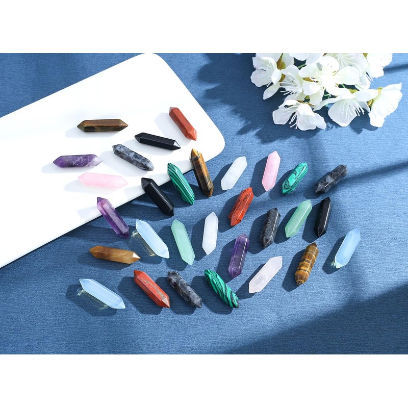 SPECIFICATION:Crystal Point Size: 1.31*0.31 inch .Weight:About 250g Material:high quality natural quartz stone.The color and quantity are Amethyst*5, Rose Quartz*5. Clear Quartz*5,Green Aventurine*5,Tiger Eye*5,red jasper*5,Labradorite*5,Malachite green*5 Crystal,Red Jasper.*5. Obsidian*5.Opal*5