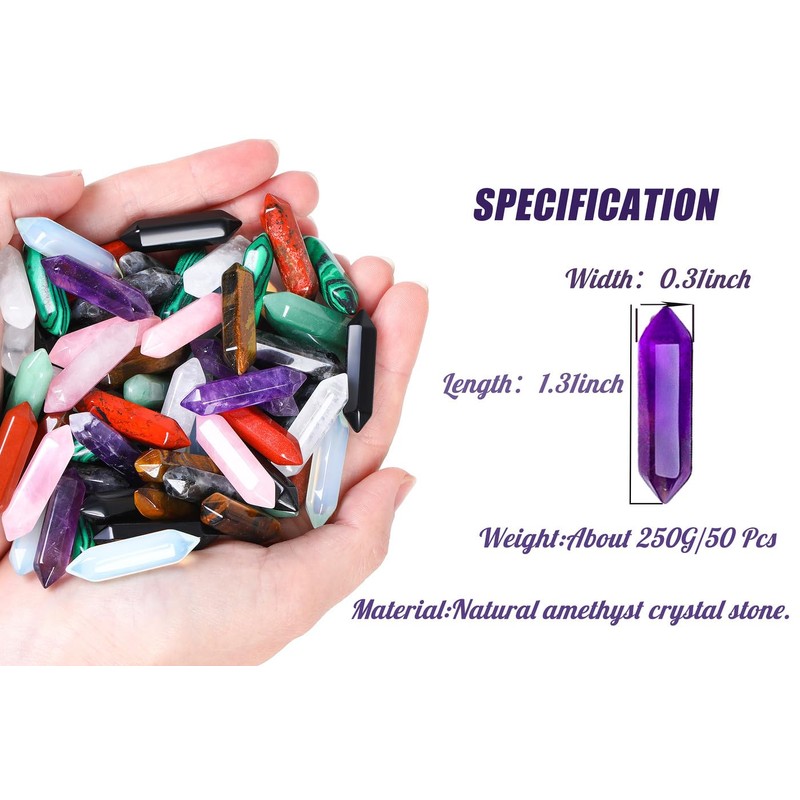 - 【SPECIFICATION】:50 Pcs Crystal Point Size: 1.31*0.31 inch .Weight:About 250g:Material:high quality natural quartz stone.The color and quantity are Amethyst*5, Rose Quartz*5. Clear Quartz*5,Green Aventurine*5,Tiger Eye*5,red jasper*5,Labradorite*5,Malachite green*5 Crystal,Red Jasper.*5. Obsidian*5.Opal*5 Weight:250 g. Package: 50 pcs crystal points are packed in exquisite velvet bags and gift box. Suitable size for easy portability