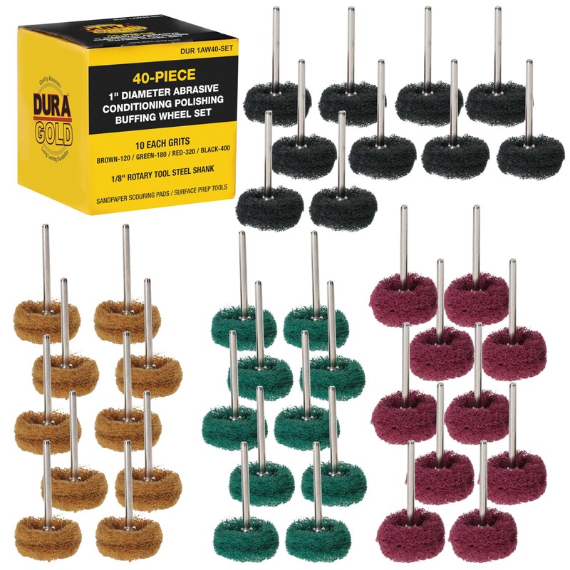 - Dura-Gold 40-piece 1" diameter abrasive conditioning, polishing, and buffing wheel set with 10 each of grits 120 brown, 180 green, 320 red, and 400 black. They have 1/8" steel shanks for use with rotary tools, grinders, hand drills, and other power tools.