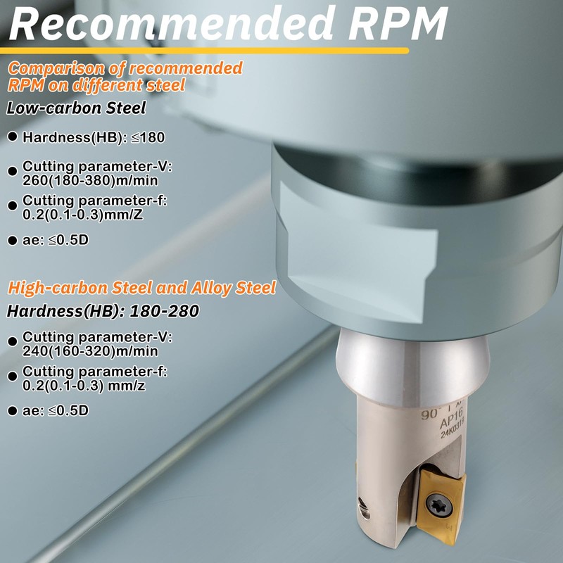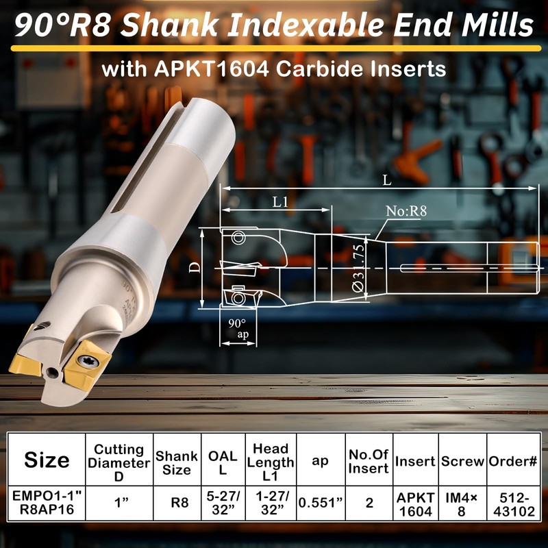 - Cutting Efficiency: pre-installed with 2 APKT1604 coated carbide inserts, this indexable end mill enhances cutting efficiency and extends tool life; The inserts contribute to the high-speed and effective performance of this R8 shank indexable end mill