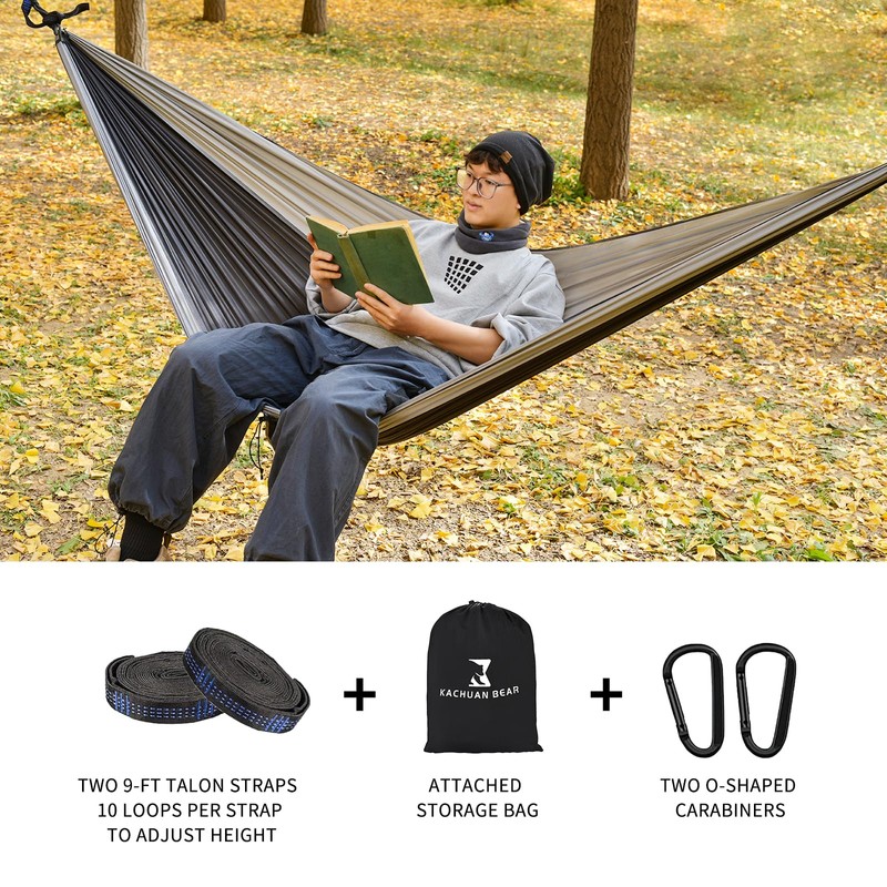 - COMPLETE KIT - With each hammock you will find two long 9 ft tree-hanging straps, 2 steel carabiners, and an attached carry bag, making setup a breeze. NOTE: Test your hammock strength before getting on.
