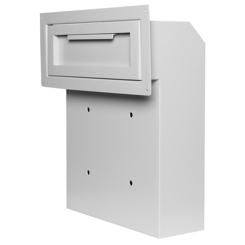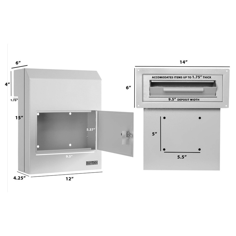DuraBox D500 through-the-door locking drop box provides secure all-day depositing of valuable or private items such as cash, checks, car keys, remotes, small envelopes, and more. It features a piano hinge reinforced double steel door to prevent prying. Metal baffle inside the drop opening protects against fishing. Includes a pair of tubular keys that are harder to duplicate than standard keys for added security. 9-1/2" wide opening standard letters. Accommodates drop items up to 1-3/4" thick. The Durabox D500 through- door drop box requires making a rectangular cutout in a door. Features: Maximum thickness of drop items is 1-3/4" thick Designed for inside door mounting with the drop opening facing outside Piano hinge with reinforced double steel door protects against prying Tubular style key lock with Double "D" configuration (can be retrofitted with other cam locks) Recommended for inside use only Metal baffle protects drop opening from fishing 2 tubular keys Fits doors up to 1-3/4" thick Pre-drilled mounting holes in back (includes hardware) Other Specifications: Drop Opening: 9-1/2" W x 1-3/4" HRear Collection Door: 9-1/2" W x 5-3/8" H Rear Collection Door Thickness: 1/8" Capacity: 505.25 cu in. Exterior Dimensions: 15" H x 12" W x 6" D Weight: 17 lbs. Warranty: 1 Year Manufacturer (applicable when used indoors only)