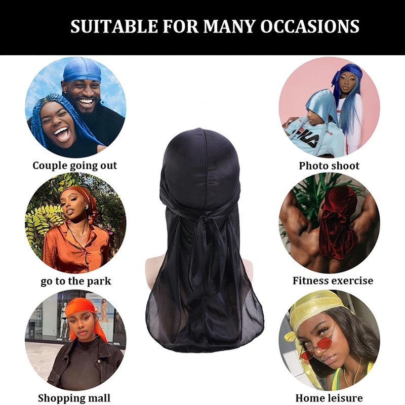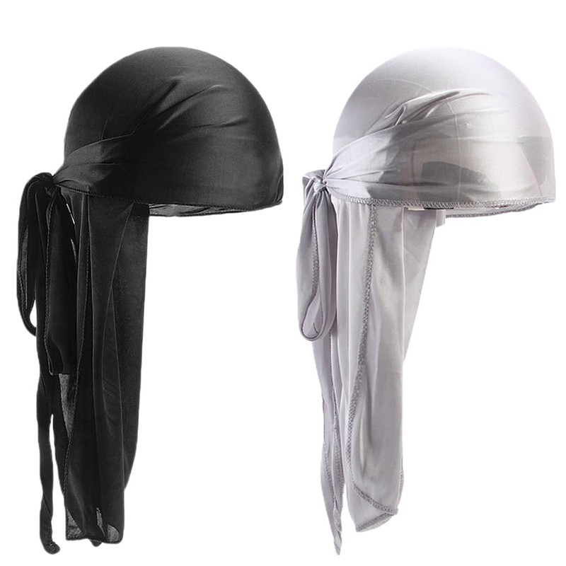 - ♂️【Function】: A total of 2 long durag headbands. 2 colors: black and grey. Comes with a long tail so you can create different styles. Silky Durag is designed to create and hold waves, fix hairstyles and even cover the head. It is versatile while protecting your head and neck from the sun.