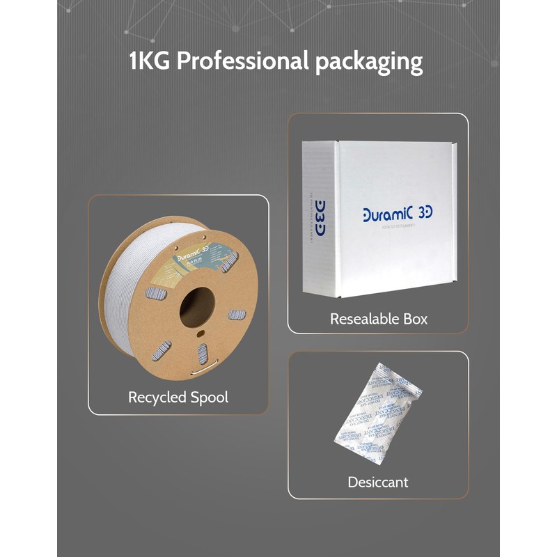 Duramic 3D plans to switch gradually from plastic spools to cardboard spools, in order to better protect the environment. The cardboard spool is made of compressed recycled paper, which is a scientific reuse of recycled resources. Besides, the paper spool, along with the paper sticker, is easily for sorting and recycling itself.