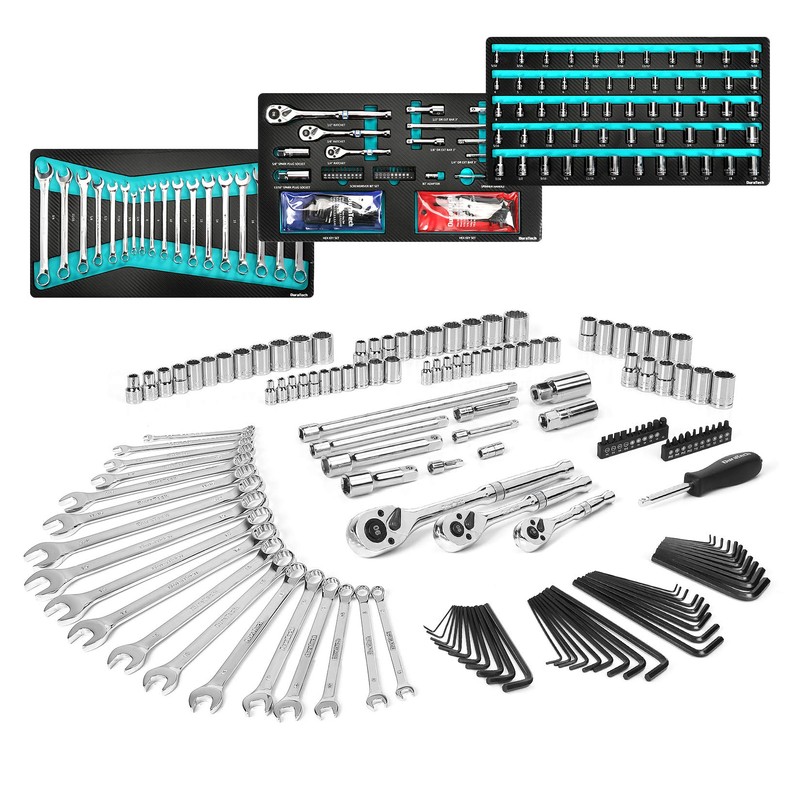 - What You Get - 3pc Ratchet Wrench; 2pc Spark Plug Socket; 7pc Extra Bar; 1pc Spinner Handle; 1pc Adaptor; 57pc Sockets Set; 18pc Wrench Set; 20pc Metric Hex Key Set; 20pc Metric Hex Key Set; 20pc Metric Hex Key Set; (Please refer to the details page below for the specific size of each tool)