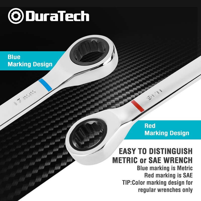 • The color markings on the wrench make it easy to distinguish between Metric and SAE, blue marking is Metric, red marking is SAE. TIP:Color marking design for regular wrenches only