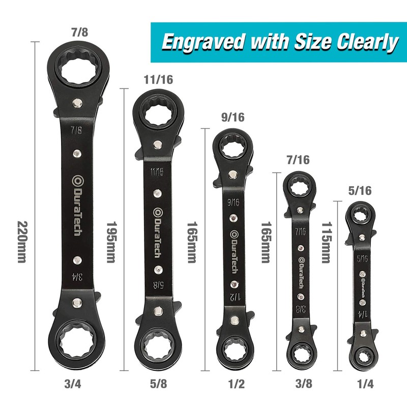 - 【EASY TO CARRY】Specification: A storage bag + 5 Pieces reversible ratchet wrench. Multiple Sizes(SAE): 1/4, 5/16, 3/8, 7/16, 1/2, 9/16, 5/8, 11/16, 3/4, 7/8 in. Size conveniently stamped on both ends of the beam for quick identification. Suitable for most nut sizes to meet your needs.
