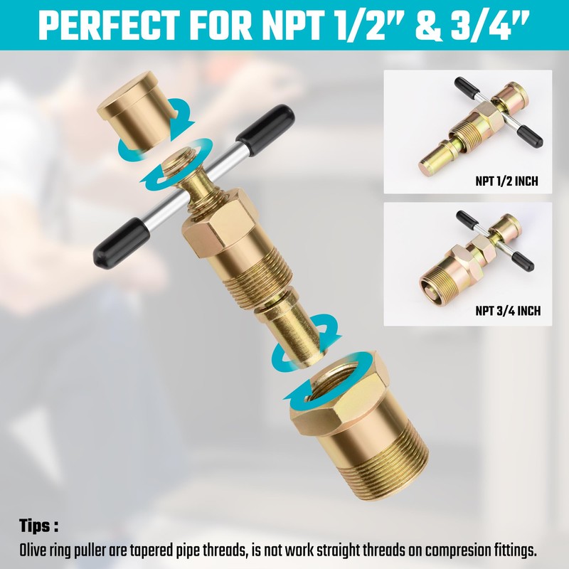 - Compact and Portable: The olive ring removal tool adopts a 2-in-1 design that perfectly fits NPT 1/2 ” and 3/4 ” brass pipes. Its compact size and weight of only 252 grams make it easy to carry and store