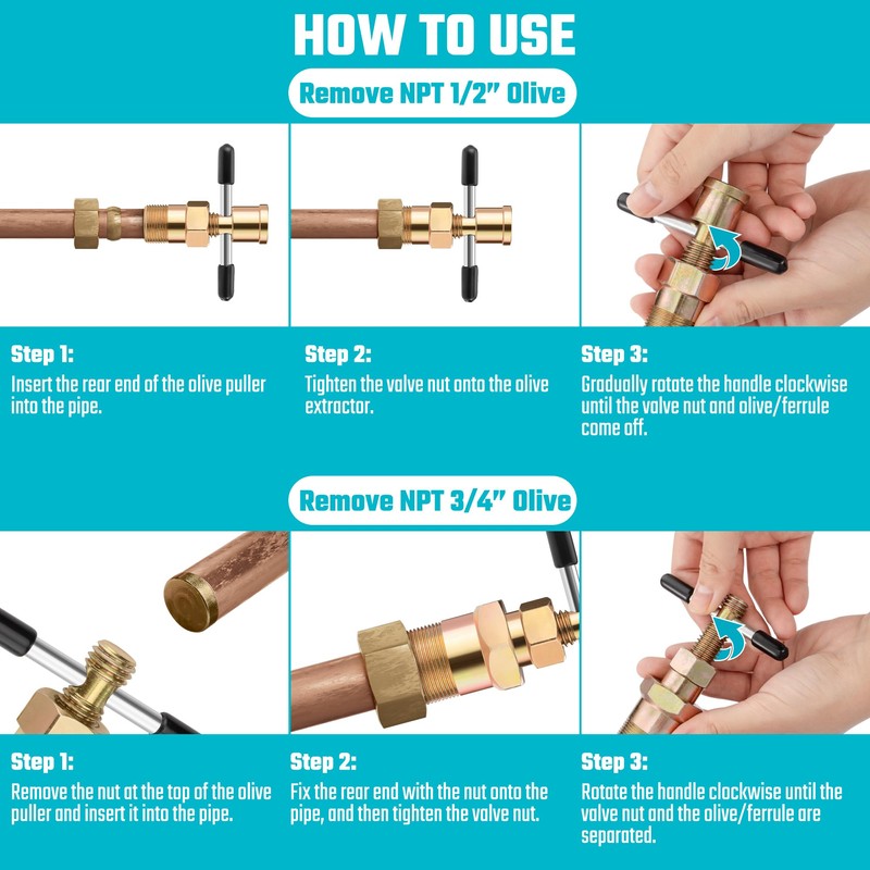 - Compact and Portable: The olive ring removal tool adopts a 2-in-1 design that perfectly fits NPT 1/2 ” and 3/4 ” brass pipes. Its compact size and weight of only 252 grams make it easy to carry and store