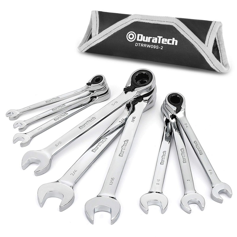 DURATECH Reversible Ratcheting Combination Wrench Set, SAE, 9-Piece, Open end Spanner with Rolling Pouch, 1/4'' to 3/4", 12 Point, CR-V Steel