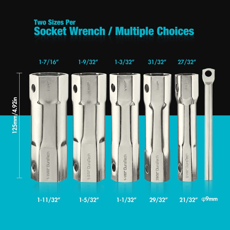 DURATECH Shower Valve Socket Wrench Set with Bar Handle for Removing Tub & Shower Valve,5-Piece, includes 21/32”x 27/32”, 29/32”x 31/32”, 1-1/32” x1-3/32”, 1-5/32”x1-9/32”, 1-11/32”x 1-7/16”