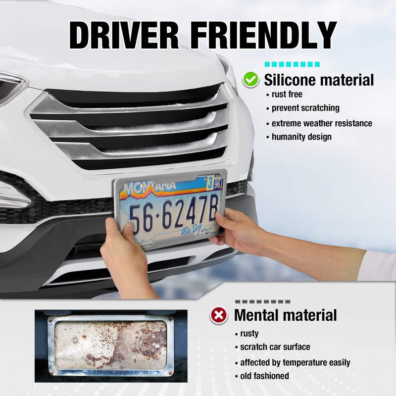 - Durable Material: The rust proof license plate frame is made of high quality silicone, which will not be rusty in humid environment. They can also withstand the chemicals like gasoline and resist the heat produced from maintenance