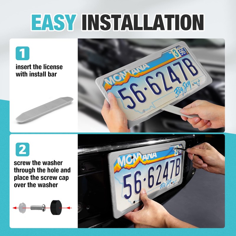 - Easy Installation: Save time and effort with the tool kits provided. The package includes 2 plate frames, 8 washers, 8 caps, 8 screws and installation bar. Screw holes, vent holes and drain holes are all pre drilled. Just insert the license and screw the washer, installation is complete