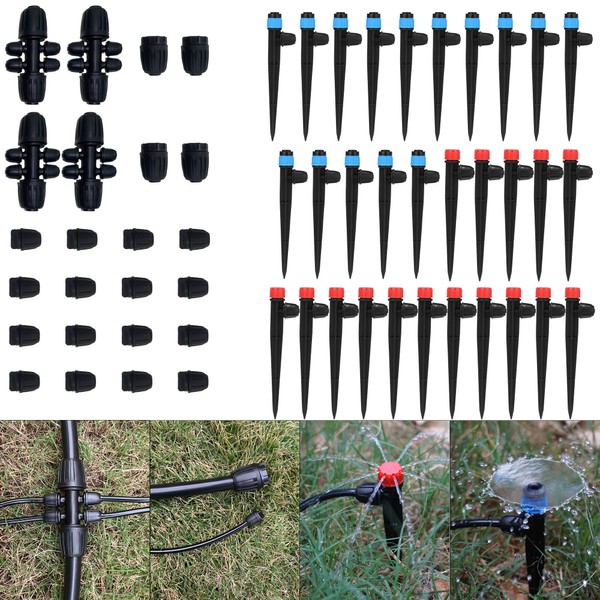 - The package includes a total of 54 components: 4 6-ways 1/2" to 1/4" drip irrigation fittings, 4 1/2" tubing end caps, 16 1/4" tubing end caps, 15 drip emitters and 15 sprayers