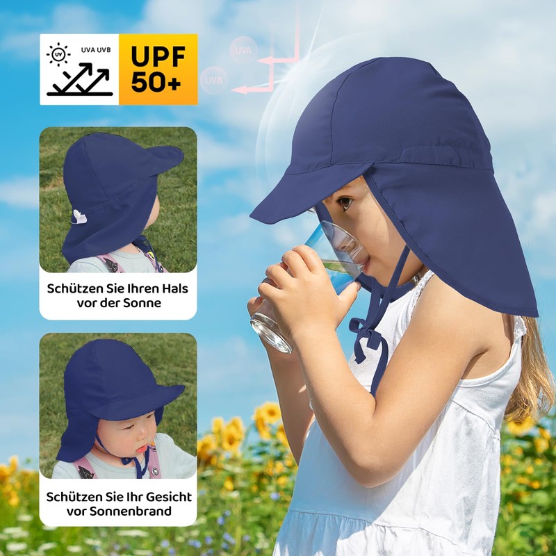 The design includes a wide peak and extended neck protection that protects children's sensitive skin from UV rays. Parents can rely on the safety and comfort while their little ones play outside, be it on the beach, in the garden or in the park. The breathable fabric ensures that your child stays cool even on hot days.
