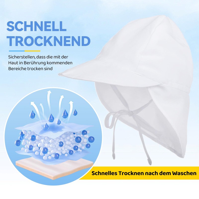 The design includes a wide peak and extended neck protection that protects children's sensitive skin from UV rays. Parents can rely on the safety and comfort while their little ones play outside, be it on the beach, in the garden or in the park. The breathable fabric ensures that your child stays cool even on hot days.