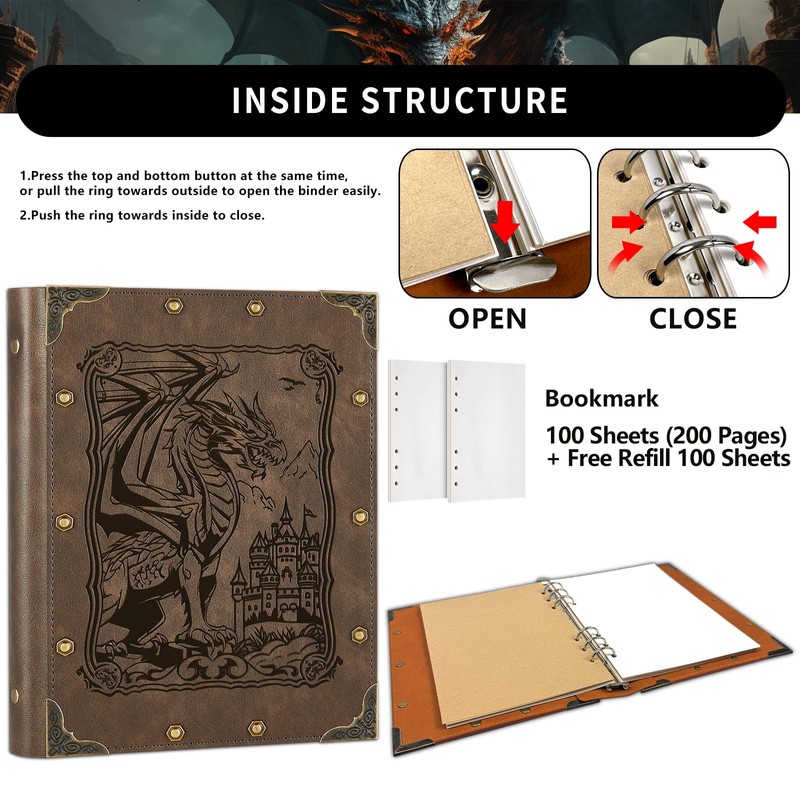 - Unique Design:Rivets with vintage faux leather complete the overall look.using embossed pattern design brings true touch,Not just printed.with metal rivets bounded around the entire cover (front and back),there are 8 pcs metal book corners covered which can protect the journal better.A great rpg accessory to increase dnd gaming experience with immersive hints by the look.