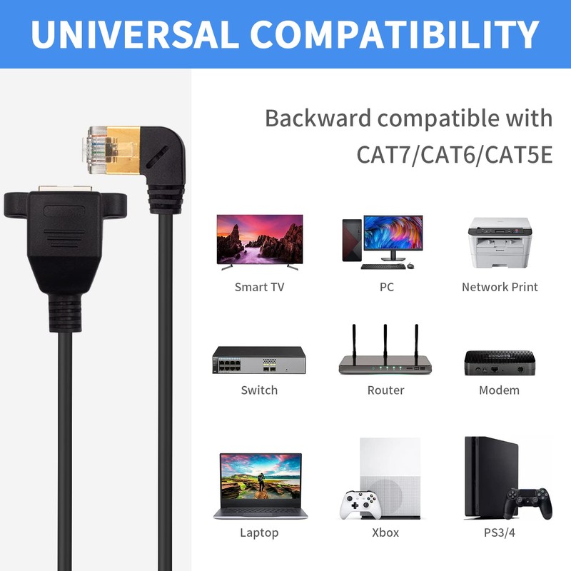 90 degree cat8 ethernet adapter cables (also called network cables, computer cables, ethernet cables and LAN cables) Backward compatible with Cat7/6/5, Ethernet Cableare used to connect components such as printers, computers, copiers, routers, servers, modems, switches, and audio and video products.