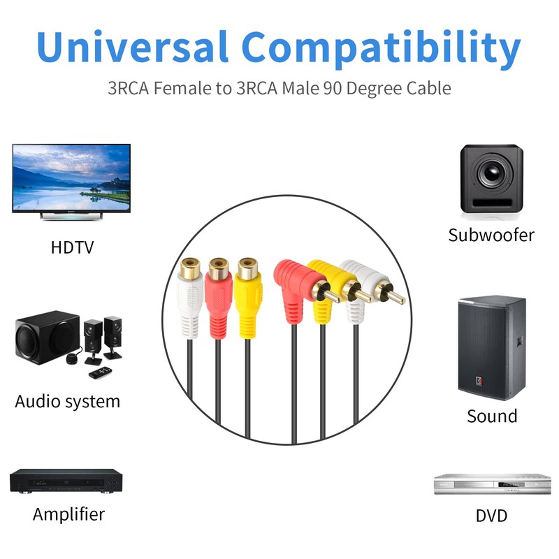 90 Degree Right Angle RCA Audio/Video Cable: Three Color-Coded RCA jacks perfectly connect your video or audio electronic device via RCA Cable to your TV. Provide you with high-fidelity sound quality and enjoy cinema-like stereo sound at home.