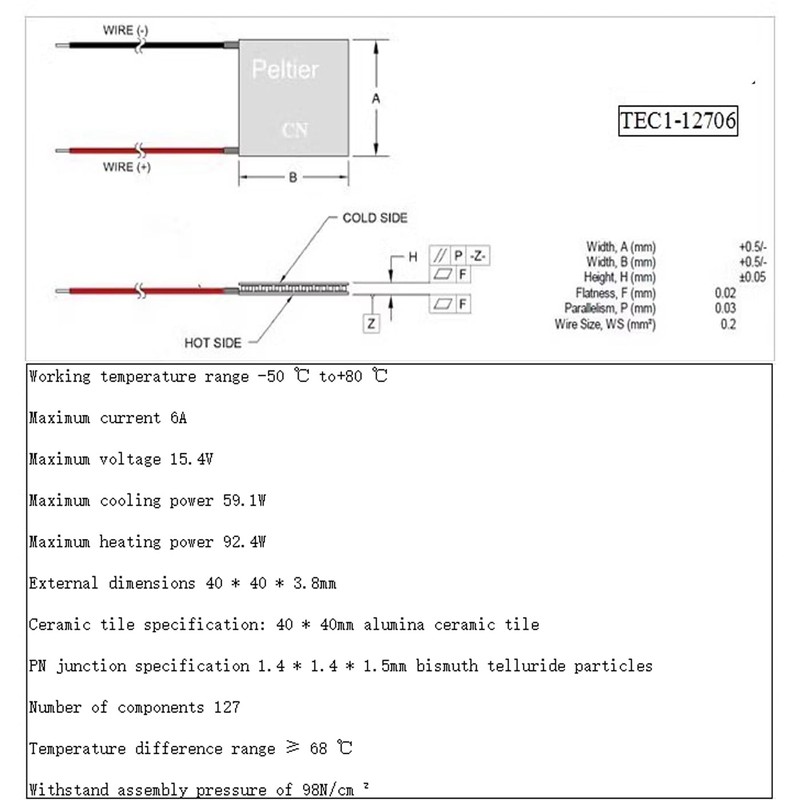 DUTTY 2pcs TEC1-12706 Semiconductor Refrigeration Tablets TEC1-12706 12V 6A Heatsink Thermoelectric Cooler Cooling Peltier Plate Module 40x40MM