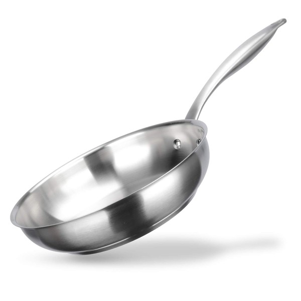 - HIGH QUALITY MATERIAL: This 9.5 inch fry pan is manufactured with 304 food grade stainless steel. Heavy gauge impact-bonded aluminum encapsulated bottom for quick and even heating.
