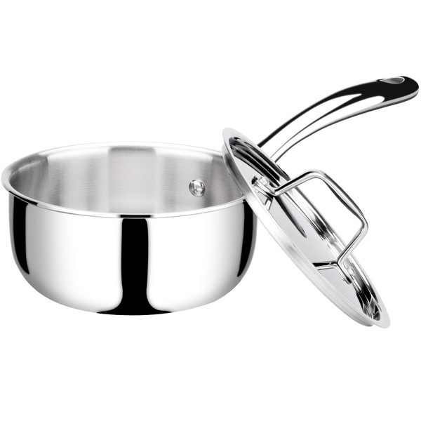 - HIGH QUALITY MATERIAL: This 1.6 quart saucepan is manufactured with whole-clad tri-ply stainless steel—ensuring even heating and eliminating hot spots.