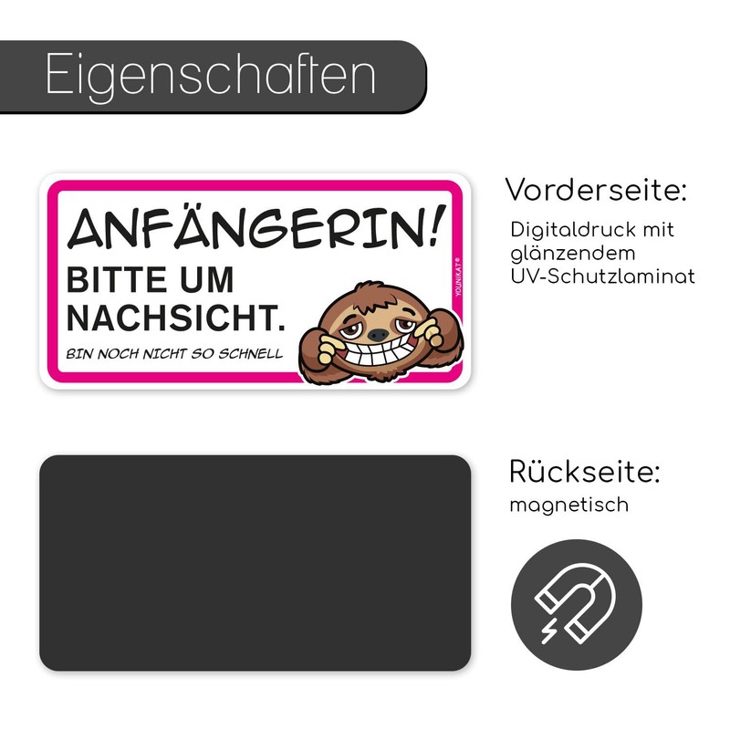 At first, you are still unsure in some situations, needs a little more time starting or changing lanes and wishes patience of other road users - with this cute sloth magnetic sign and funny saying you will alert other road users that you are a beginner.