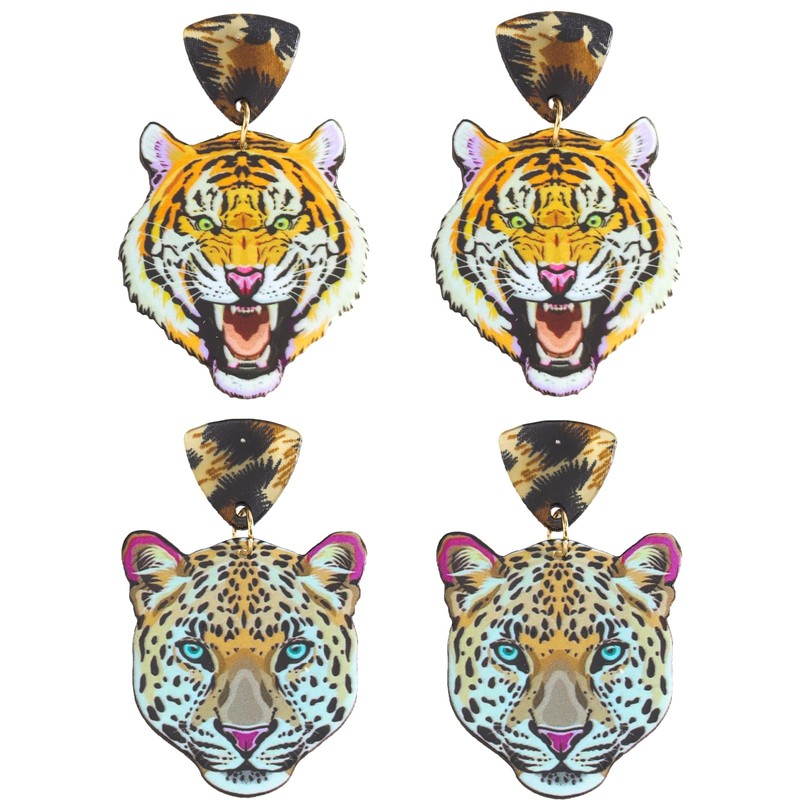 Dvacaman 2 Pairs of Acrylic Tiger Leopard Head Earrings Set for Women, Exaggerated Bold Animal Print Dangle Earrings, Lightweight Statement Jewelry for Casual Party Wear