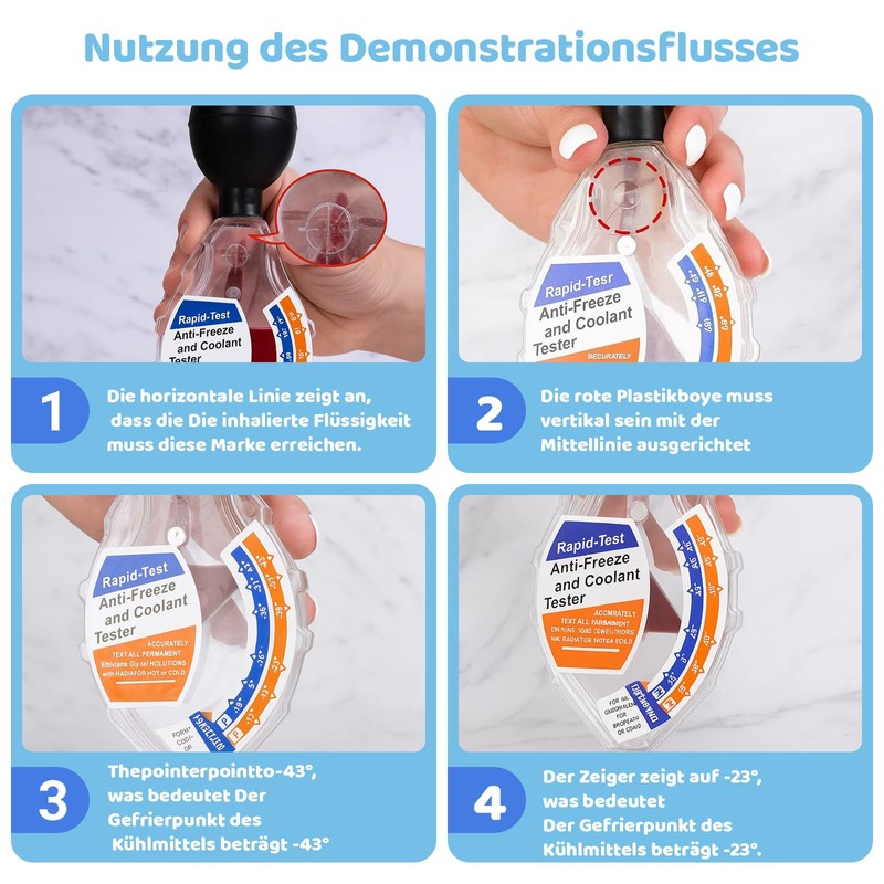 • Easy to use: the car frost protection tester for the cooling system is fast, accurate and the scales and hands are easy to read. The scales are calibrated for easy testing in °C and °F. With rubber hoses, liquids can be easily sucked into small plastic containers, which allows easier reading of the hands compared to conventional frost protection test strips.