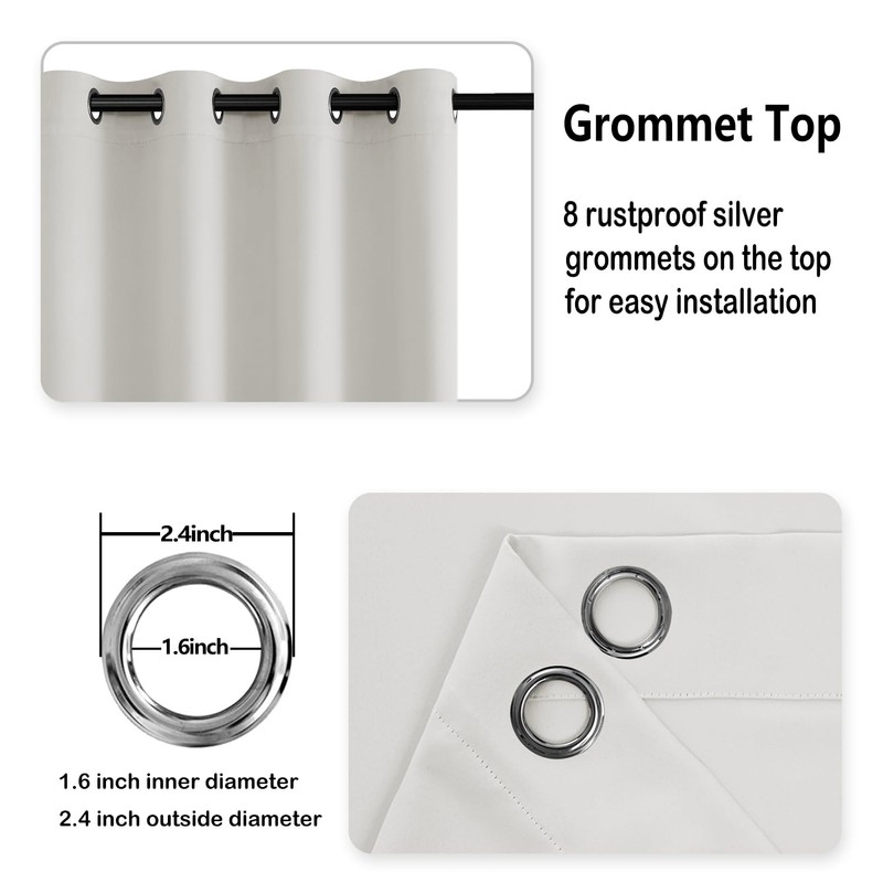 - Package Includes: 2 blackout curtain panels, each panel measures 52W X 96L inches, featuring 8 rust proof silver grommets on the top for easy installation and sliding (diameter is 1.6 inch).