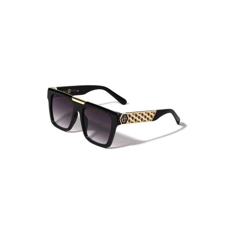 Dweebzilla Flat Top Square Gold Lion Head Medallion Coin Badge Honeycomb Retro Sport Luxury Aviator Sunglasses (Black & Gold Frame - Black Gradient Lenses)
