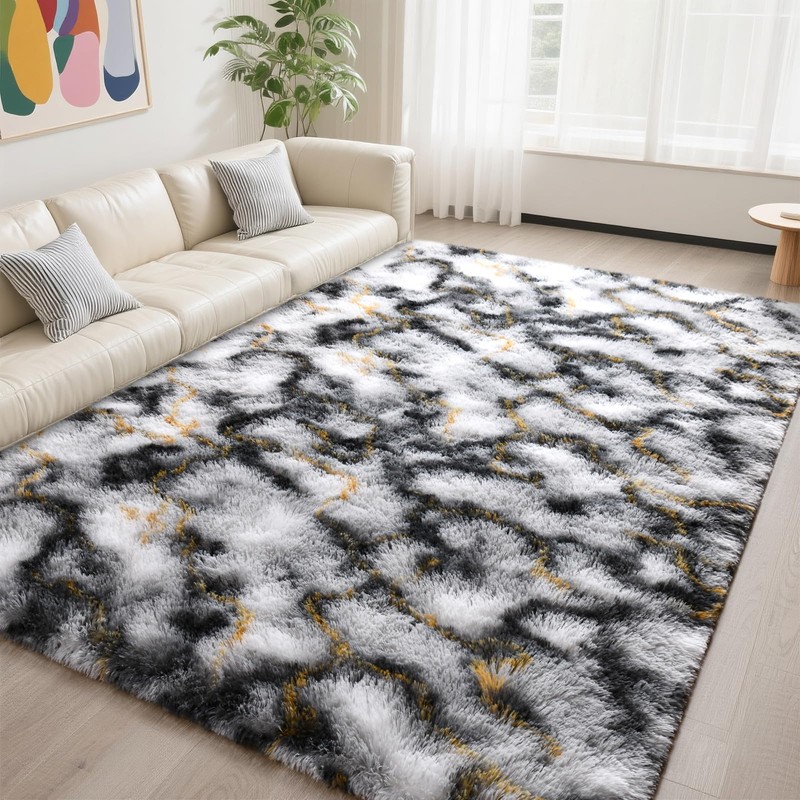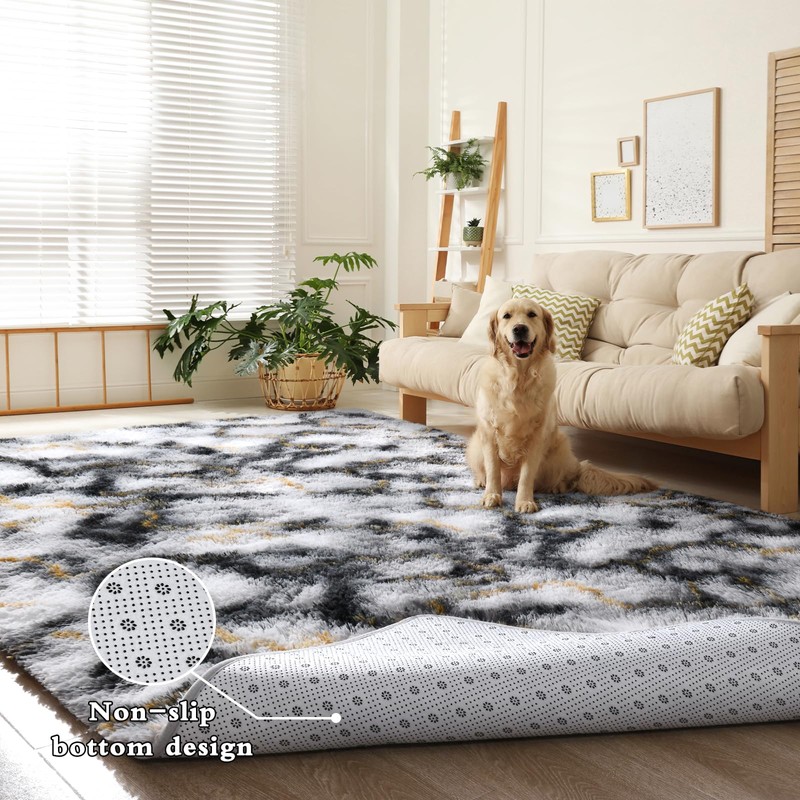 DweIke Fluffy Black White Gold Rugs for Bedroom Living Room, 5x8 Large Soft Plush Shaggy Tie-Dyed Girls Boys Kids Rug, Upgraded Non-Slip and Machine Washable Carpet for Dorm Nursery Classroom Decor