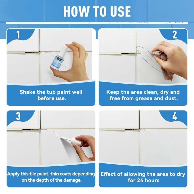 - Gentle Formula - Our bathtub paint is low odor, quick-drying, non toixc, washable, stain and high adhesion, making this tile paint safe for adults, children, and pets. For best results, clean the repair area before painting and allow sufficient drying time between coats.