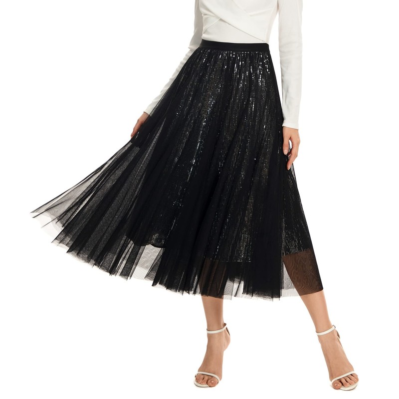 Dwirapal Sequin Long Tulle Skirt Layered Flowy Fairy Sparkle Party Mesh Tea Length Big Hem Skirts for Women