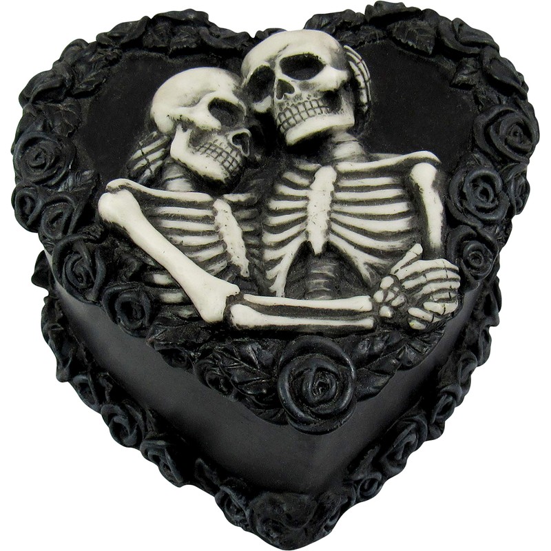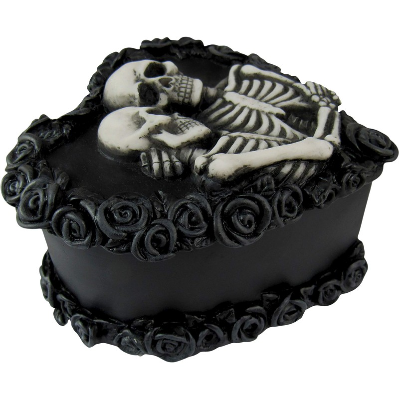 DWK - To Have & To Hold - Beautiful Gothic Skeleton Lovers Embracing on Black Rose Wreath Keepsake Jewelry Trinket Stash Box with Red Interior Romantic Goth Valentine's Day Home Decor Accent, 5-inch