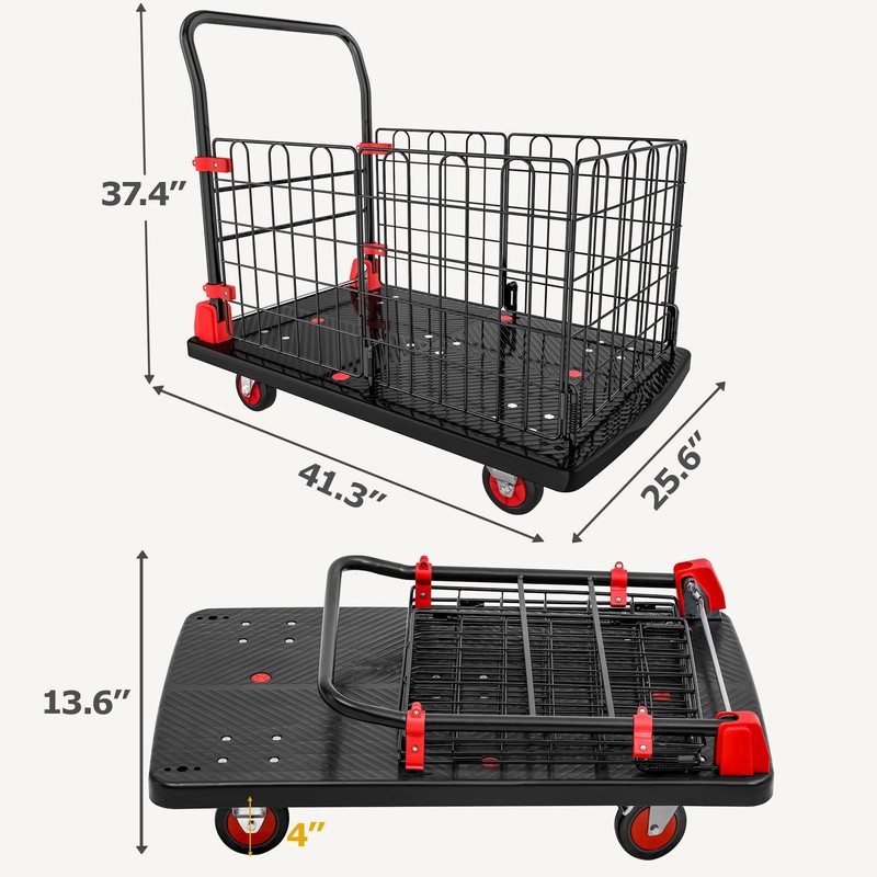 - Sturdy & Stable Construction: The DWVO Platform Truck Cart is designed for outstanding durability and stability. Built with high-strength, heavy-duty steel and polyethylene, it ensures reliable performance in tough conditions. With 30% thicker fence, it further reinforce the structure. This robust construction allows the cart to support up to 1000 lbs, making it an ideal choice for transporting heavy goods safely and securely. Each cart is professionally tested before leaving the factory.