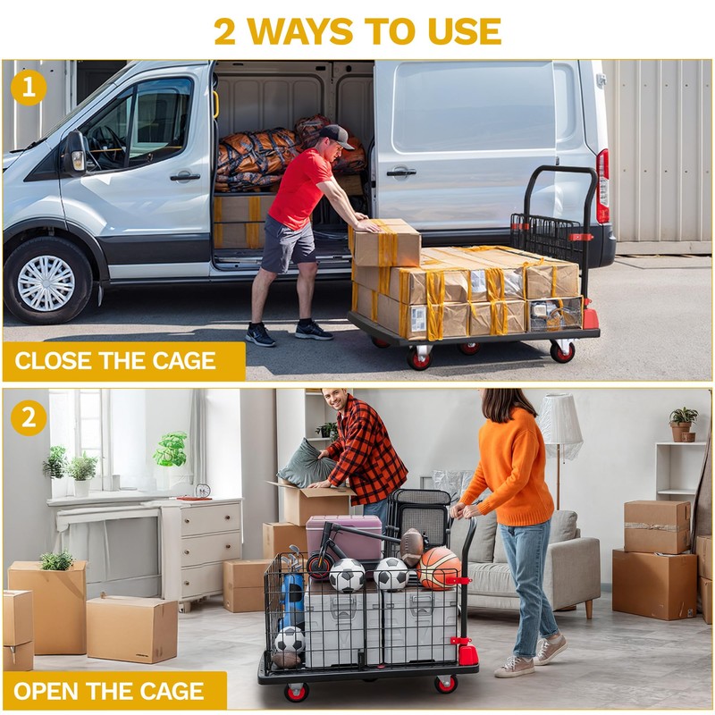 DWVO 1000 LBS Platform Truck Cart with Cage, Trolley Cart with Wheels, Heavy Duty Hand Moving Dolly Cart, Foldable Dolly Cart with Wheels for Warehouse Luggage Moving