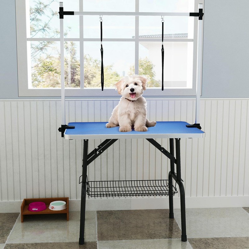 - Adaptable and Stable: The adjustable grooming arm accommodates pets of various sizes, with simple height adjustments using a knob; Rubber feet on the H-shaped legs protect your floors from scratches while keeping the table stable and quiet