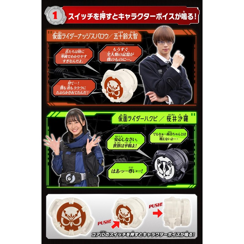 - The Kamen Rider Nudge Sparrow Sound Core ID includes 10 different scriptions from the Kamen Rider Nudge Sparrow / Taichi Gotozu (acting: Daisyo Godo), and the Kamen Rider Hakubi Sound Core ID includes more than 10 scriptions from the Kamen Rider Hakubi/Sakurai (Sara Sakurai Shida)