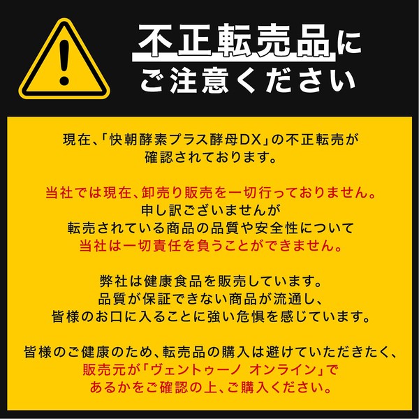 - 🔽※お買い求め前に※ 快朝酵素プラス酵母DXは販売元である【ヴェントゥーノ オンラインショップ】以外で購入された場合、その品質等について一切の保証をいたしかねます。