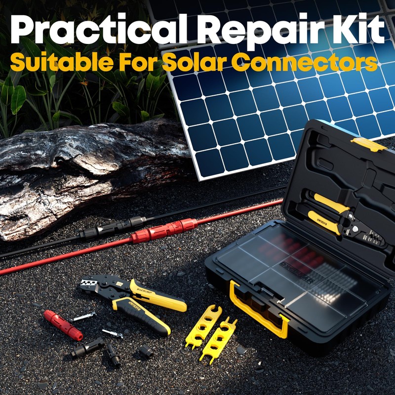 - Versatile Design: This set includes solar crimping pliers, solar wire stripping pliers, 2 photovoltaic wrenches and 12 pairs of solar connectors (including 6 red 6 black male/female solar panel cable connectors), which can meet various application scenarios.