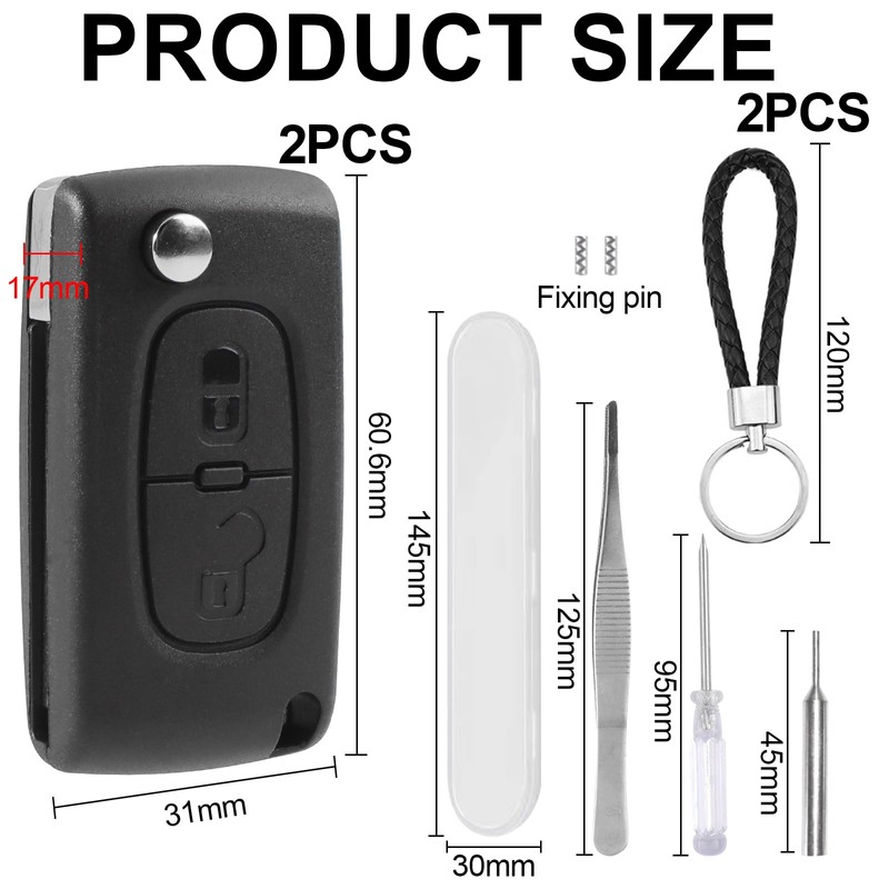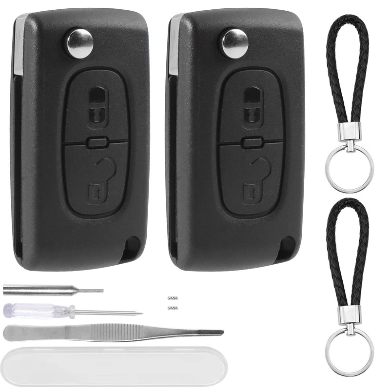 Spezifikation:Material: ABS-Kunststoff, MetallFarbe: SchwarzKnopf: 2 TastenModell: CE0536Autoschlsselgeh?use Gr??e: 6 x 3,1 x 1,7 cmAutoschlsselring L?nge: 12 cmBefestigungsstift Gr??e: 0,2 x 0,5 cmTransponder Chip: NeinLeiterplatten: NeinElektronik/Batterie: NeinKompatible Modelle:Fr Peugeot 207Fr Peugeot 307Fr Peugeot 307SFr Peugeot 308Fr Peugeot 407Fr Peugeot 607Fr Citro?n C2Fr Citro?n C3Fr Citro?n C4Fr Citro?n C5Fr Citro?n C6Fr Citro?n C8Fr Citro?n XsaraAchtung:1. Das kompatible Modell des Produkts ist nur als Referenz, berprfen Sie bitte sorgf?ltig Ihre ursprnglichen Autoschlssel, um zu sehen, ob es das gleiche wie unser Produkt Bild vor dem Kauf ist.2. Dieses Produkt ist Auto Schlssel Geh?use nur, Fernbedienung/Batterie/Elektronik/Transponder-Chip ist nicht enthalten.3. Lassen Sie die Klingen bei Ihrem ?rtlichen Schlsseldienst/H?ndler schneiden oder ersetzen Sie sie durch Originalklingen, die zu den Klingen Ihres Autos passen.Paket enthalten:2 x 2 Tasten Autoschlssel Geh?use (CE0536, HU83)2 x Auto Schlsselanh?nger1 x Schlitzschraubendreher2 x Befestigungsstifte 2x5 mm1 x Pin Entfernungswerkzeug