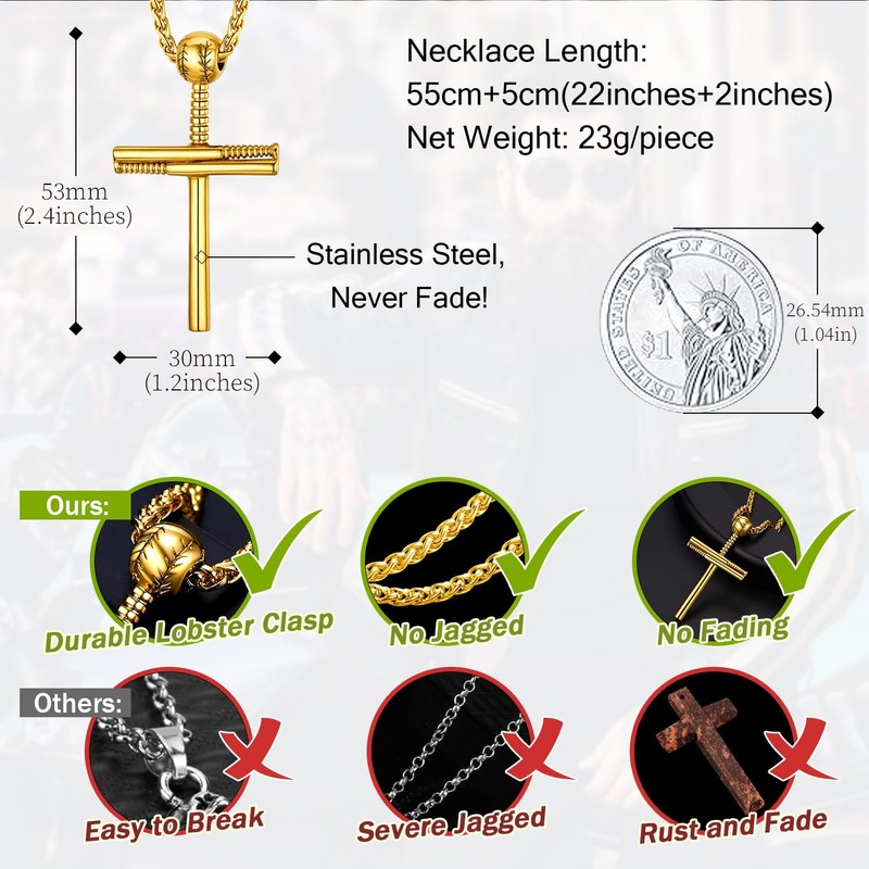 • 【Size and packaging】This cross necklace includes 1 pendant + 1 chain; Length of chain:22 inches+2 inches extending chain (Adjustable), the chain is finished with a matching stainless steel lobster clasp.