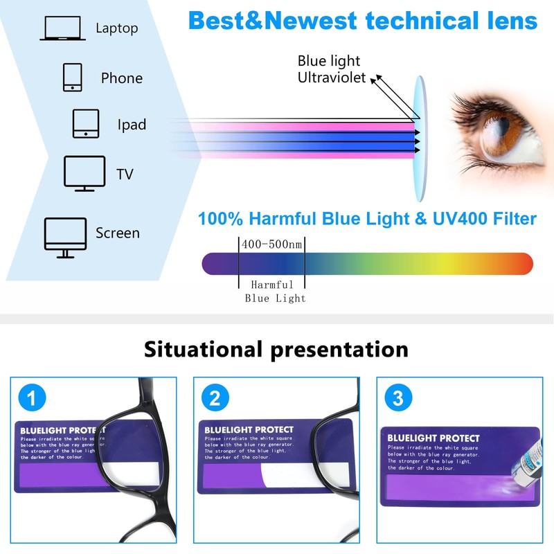 - Blue Light Blocking: these eyeglasses are added blue blocking factor into the lens, which will protect your eyes from harmful blue ray while working with computer or enjoying casual phone time