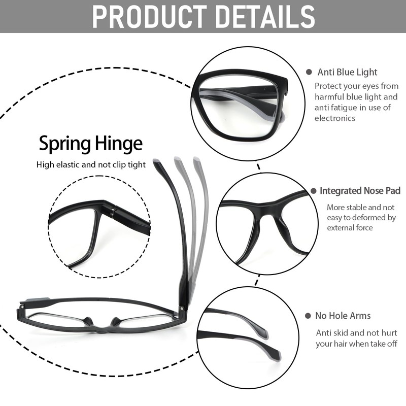 - Spring Hinge: The glasses connect arm and frame with spring hinge, which is more elastic and don't clip your face tightly