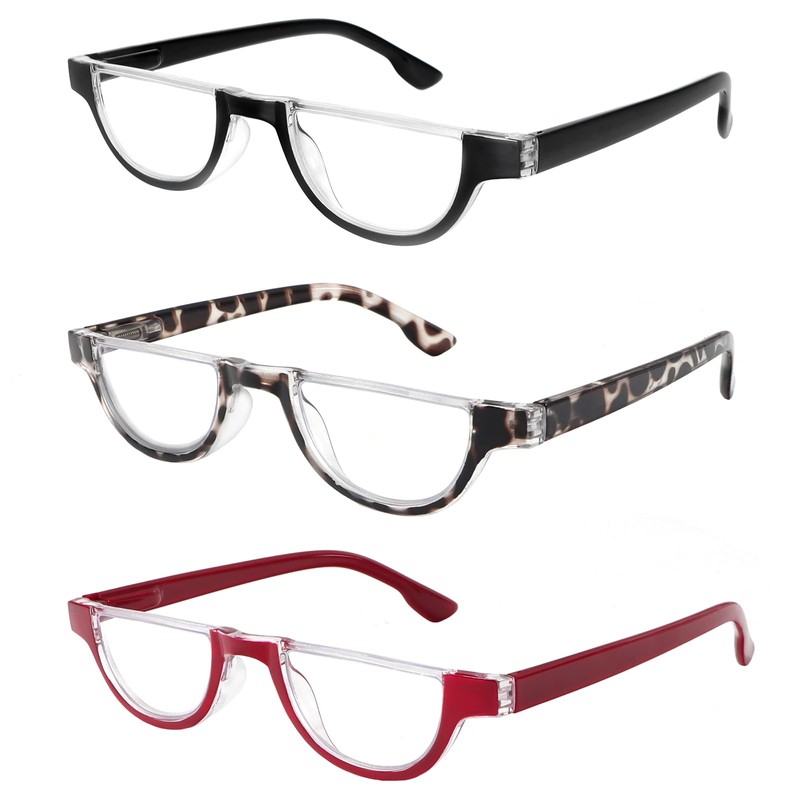 DXYXYO Half Moon Reading Glasses for Women, 3 Pack Small Semi Frame Readers with Spring Hinge Blue Light Blocking, 1.0 Black+leopard+red